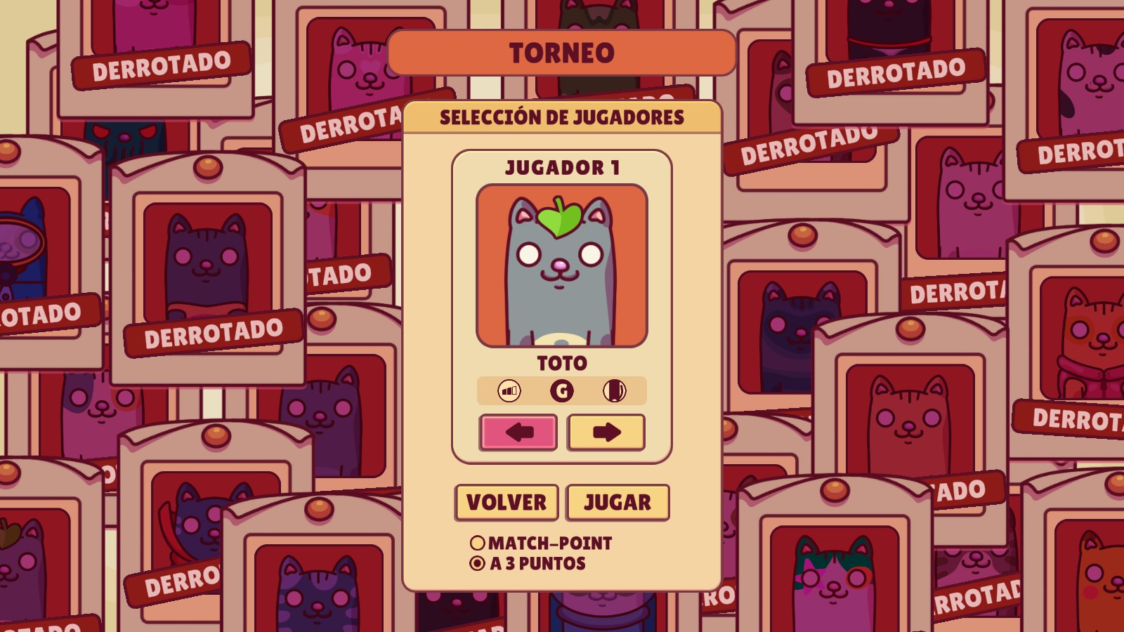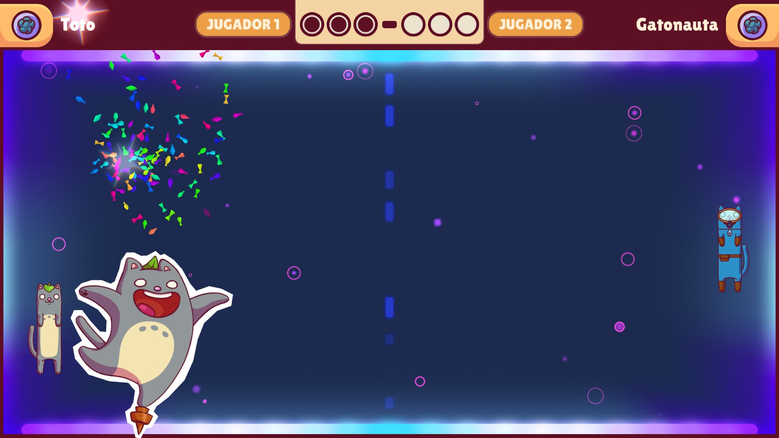 Enfocándonos en lo mecánico, a lo largo de cada partida aparecen distintos powerups y trampas que pueden perjudicar a tu contrincante, o más bien, darte alguna ventaja por una breve franja de tiempo. Entre estos podemos encontrar la posibilidad de que el oponente no pueda moverse, que se vuelva más pequeño o que sus movimientos sean menos precisos. También hay algunos beneficios que podes conseguir a lo largo de la partida como volver a nuestro gato más grande, haciendo que los golpes sean aún fáciles y dejando muy poco margen para el error.
