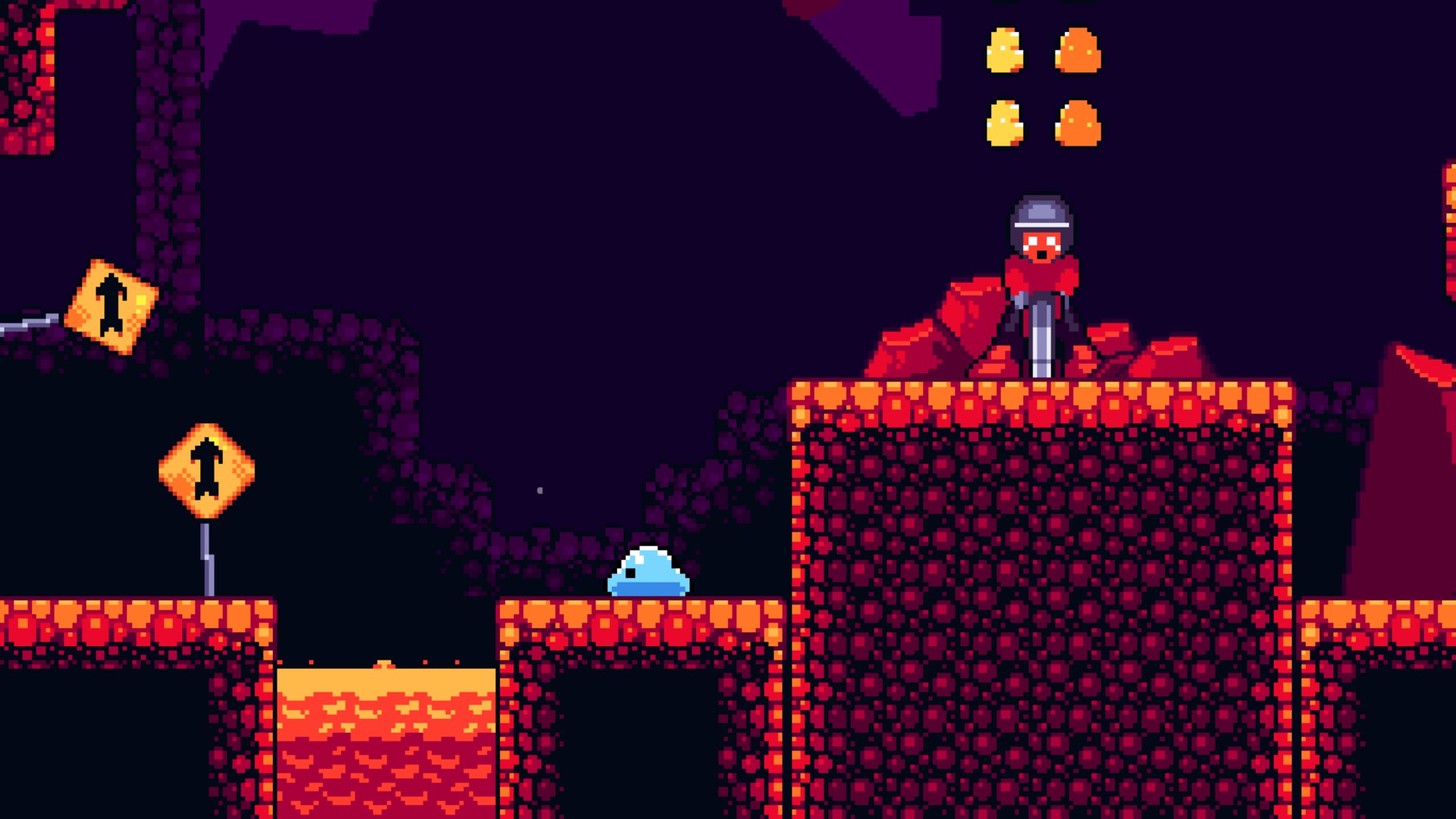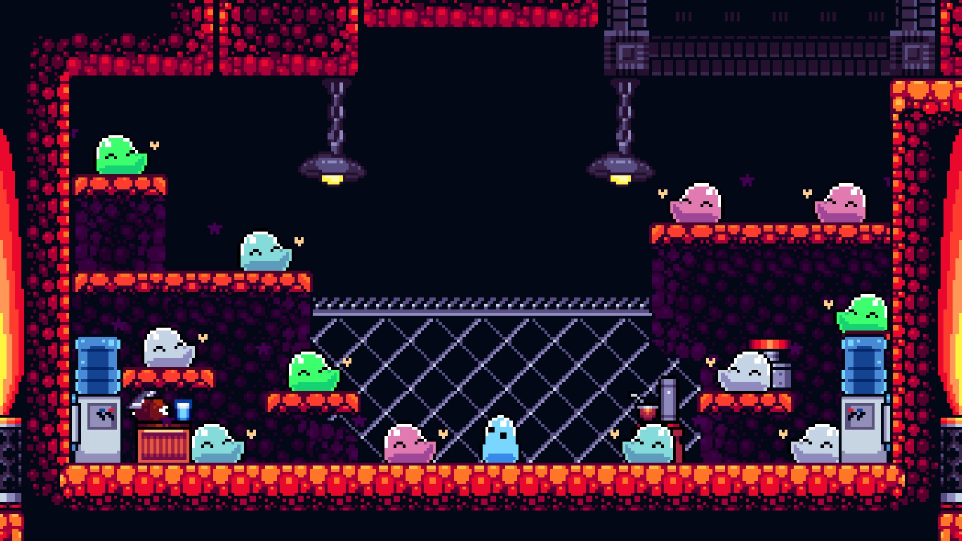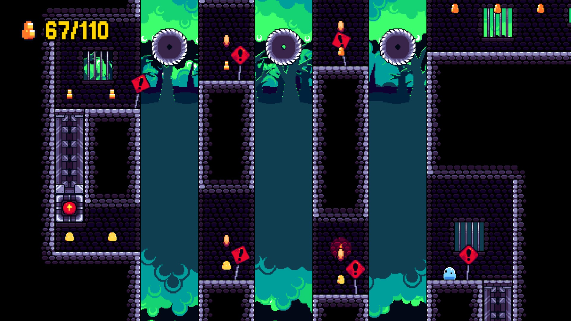 Ahí es donde Go Slimey Go! mira todo esto, se ríe en la cara de Foucault y nos propone algo distinto. El juego está dividido en diferentes niveles, nuevamente, característicos de su género, “el mundo de lava”, “el de hielo”, los primeros de praderas hasta los más desafiantes con sierras y estilo industrial, en los cuales nosotres, un pequeño Slime, debemos atravesar para llegar a la casa de sus otros amigos Slime que lo esperan para tomarse unos buenos matecitos. Pasando por plataformas, lagos, pinchos y enemigos a los que no podemos matar, sino que sólo podemos saltarlos (mecánica que puede tanto dificultarnos el camino, como usarse a nuestro favor). No puedo saltarles en la cabeza y acabar con ellos como en Sonic, ¿por qué?. Claramente es una decisión de gameplay, pero también tiene su “historia”.