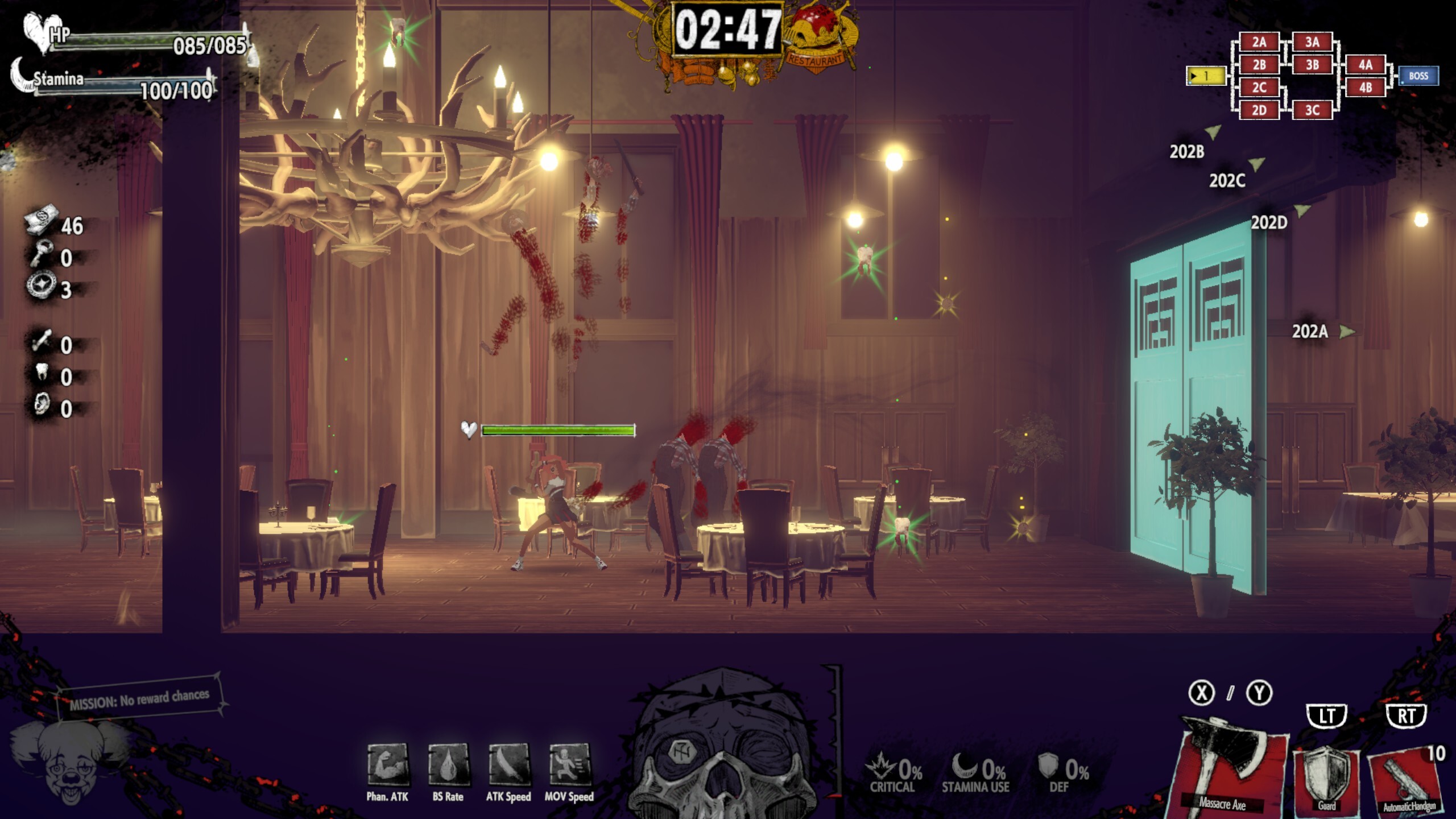 Una vez listos para arrancar la partida, accedemos al mapa que nos muestra las inmediaciones del Hotel y secciones que iremos desbloqueando a medida que venzamos al Jefe de cada Zona. Cada una de estas Zonas se componen de varias Salas que tiene distribuidas diferentes Puertas que permitirán acceder a la siguiente sala y así hasta llegar al Jefe de la Zona. Al atravesar cada Puerta nos dará diferentes mejoras para nuestra run, ya sea mejorar velocidad, ataque u objetos especiales y para llegar a ellas debemos enfrentarnos a oleadas de enemigos por caminos que se dividen en diferentes niveles de altura, con una vista lateral, marcando su lado plataformero.