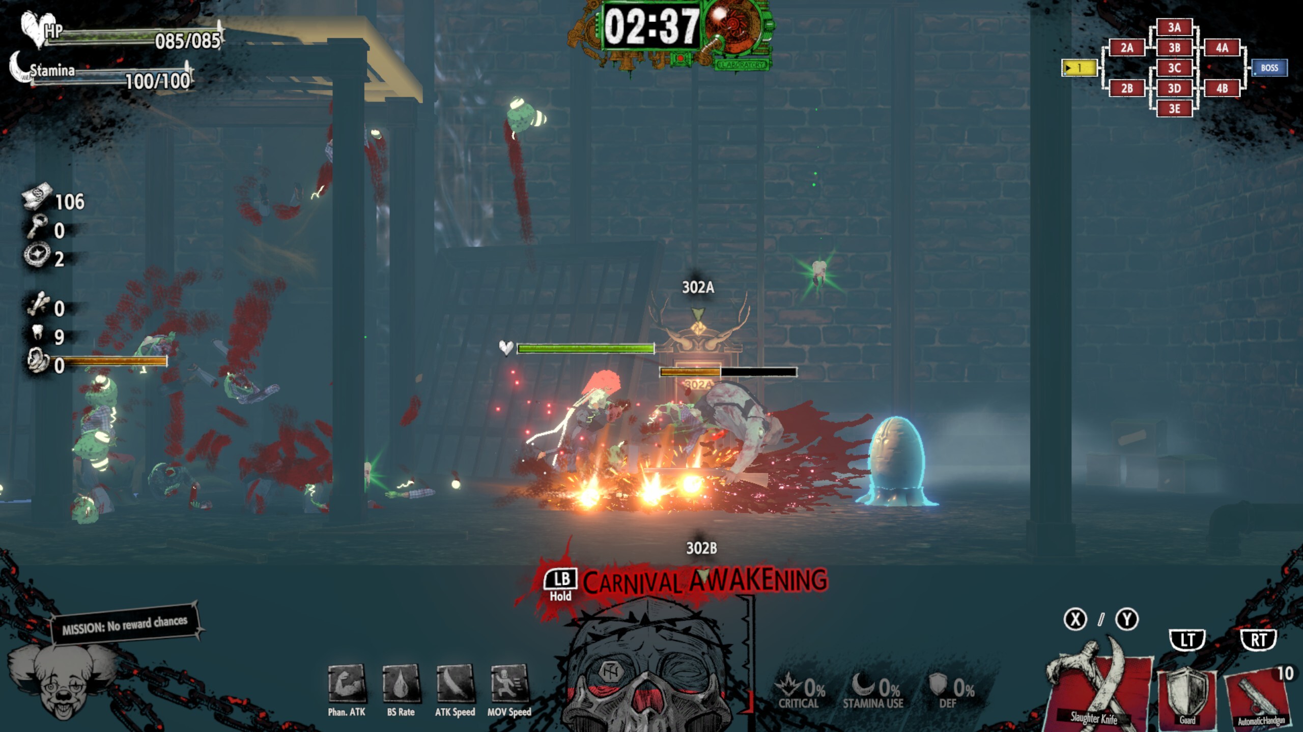 Al dividir cada Zona de manera independiente de la anterior, una vez que hayamos vencido a un Jefe, no tendremos necesidad de volver a atravesar esos escenarios. El árbol de habilidades está limitado por cuántos Jefes hayamos vencido, donde en otros roguelike la progresión es constante, acá llega rápidamente a un techo hasta que no venzamos al jefe de turno, lo cual genera un problema. Supongamos que en la primer Zona ya pudiste aumentar todas las estadísticas disponibles y comprar todas las armas, no tenemos razón para pelear con los enemigos de cada sala por recursos porque, como buen roguelike, los recursos que no se canjean se eliminan, así que lo único que podés hacer durante la run es correr por la sala para atravesar la primer puerta que encuentres para llegar lo más rápido posible al Jefe de Sala sin que los enemigos te quiten vida, lo que crea baches enormes de gameplay. Y no es un caso hipotético, fue mi propia experiencia.