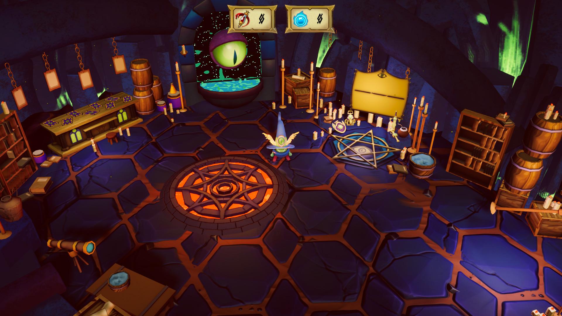 Con un estilo 3D de dibujos estilo “cartoon” y una vista top down (desde arriba), abordaremos varios enfrentamientos, divididos en escenarios delimitados con pisos hexagonales que asemejan a los de un tablero de juego. Al derrotar a los enemigos recolectaremos recursos para poder canjearlos por mejoras y nuevas habilidades. Cada escenario está dividido (o sea que se juega de manera independiente como si de un nivel se tratase), y una vez superado ya no se puede volver a jugar, siempre avanzamos hacia adelante y si morimos lo volvemos a intentar. La única forma de obtener los recursos es ganando, al morir perdemos todo, lo que quiere decir que el mejorar nuestras habilidades tiene un límite finito, porque una vez que tengamos que enfrentar al jefe final, no habrá manera de mejorar ningún atributo, llegamos con lo que llegamos. Y si no distribuiste bien tus habilidades, bueno, mala suerte. Esto no sería un problema si el juego optara por tener un tope bien claro en las habilidades. Que el distintivo de enfrentar a la Bruja sea: usar tu aprendizaje del juego, de saber cómo abordar una arena, más que de poderes y puntos. Pero la diferencia de dificultad entre una arena común y el jefe final es grande, muy grande. Sumado a la mala precisión de los controles (que hasta entonces era tolerable), se vuelve una tarea frustrante.