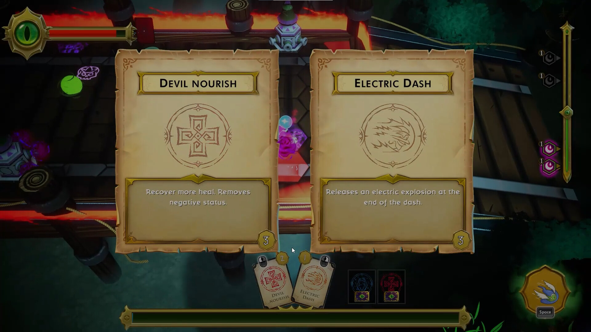 Las cartas aparecen aleatoriamente en el mapa, pueden aparecer hasta tres variedades distintas, las cuales podrás pre seleccionar en la base, dándole variedad y versatilidad al combate. Al recogerlas van sumándose a tu mano hasta el infinito. Las cartas se suman en una larga cola y por orden de llegada, eso quiere decir que si queremos usar un efecto de curación, quizás no dispongamos de esa carta por más que la hayamos recogido porque debemos usar las que tenemos encima hasta que nos toque la buscada, dando juego a la estrategia, y queda muy bien con lo frenético de las oleadas de enemigos. Estar necesitando una carta de ataque y que sólo nos toque una y otra vez una curación, que quizás no necesitamos y sabemos que lo desperdiciamos en pos de realizar un ataque determinado, es lo más divertido del juego. Cada carta se selecciona con el mouse tocando el botón derecho o izquierdo donde se van sumando las cartas, por lo que siempre tendremos para elegir dos opciones. Quizás elegir solo el click derecho y guardar una que necesitamos en el izquierdo y no tocar el botón sin querer, esto, lo repito, es lo mejor del juego. Pensar en una estrategia en tiempo real mientras corremos por todo el escenario esquivando enemigos, recogiendo cartas y tratando de acertar ataques es donde se luce.